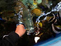 次に普通の水槽の上部です。エサを与えさせてもらえます。大きな魚が寄ってきますのでフロートの付いた爪楊枝にエサを刺し喰わせていきます。エサを蒔くと小さな魚も食べていきます。もちろん最後は手を洗い消毒も出来ます。また部屋に入るときは靴も消毒マットを踏んでの入退室です。次に係員はバトンタッチして女性の係員に誘導され、イルカたちのバックヤードツアーです。ここではイルカにタッチしたり質問に答えたりと体験させて頂けます。一番おもしろかったのが我々にも調教(指示)させてもらえます。その場でグルグル回したり、泣かせたりと教えられたパフォーマンス(動作)を一斉にすると教えられた動作をやります。まるで指導員になった感が持てます。わりと簡単でした。そして色々と裏話も聞くことが出来ました。最初1000円は高いと思いましたがまあ1000円分の価値はあったかなと思われます。 | ![]() |