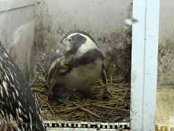 ここはペンギン館です。裏に回ると飼育小屋が有り、中でも雛を飼育しているのが見えます。左の親鳥の足元に見えにくいですがひな鳥が居てます。こんなに間近にひな鳥が見られるのは初めてですね。 | ![]() |