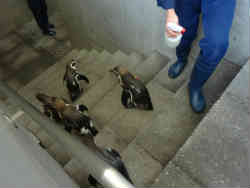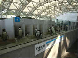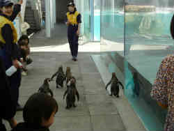 次はペンギンのお散歩タイムです。少し遅れての見学です。お姉さんに連られて5匹のペンギンが一周しています。ヨチヨチと歩き階段も何のそのです。階段はまっすぐでは降りられずやや斜めにして飛び降ります。階段だけは他の客と一緒では無く、見ているだけで降り終わったら観客も行動します。 | ![]() |