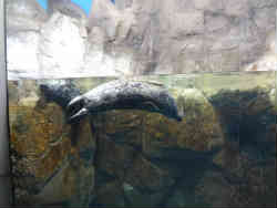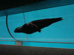 右はアザラシで左は縦長水槽の底の部分です。アシカとアザラシの違いはわかりますか?。耳の違いと歩き方です。アシカの耳は少しの突起(耳)が有り、アザラシは穴が空いているだけです。またアシカは前足を使い歩けますがアザラシは前足が弱いので這うように移動します。 | ![]() |