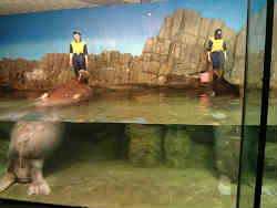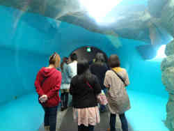 次のショーまでは時間があるので自由見学をします。まずは「チューブ」と呼ばれるところです。以前は無かったと思います。海獣コーナー(アザラシ・アシカ・ペンギン)の端にアクリルの長いチューブ(太さ1.5m径×長さ1.2m)の中を海獣達が泳ぎ回ります。また平行して人間が歩けるチューブ型の水槽の中を歩くことが出来ます。他の水族館では魚が入っていますがここは海獣のみです。 | ![]() |