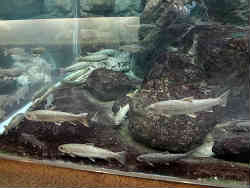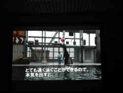 さあイベントや体験が先でやっと水族館の中へ入っていきます。右は淡水の円山川に生きる魚としてアマメやサンショウウオなど居ます。左写真は観客ゼロの飼育員達が撮った記録のDVD映像をシアターで流しています。何でもここは100%民間の営業でなかなか運営は経済的に大変らしいのです。 | ![]() |