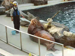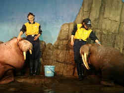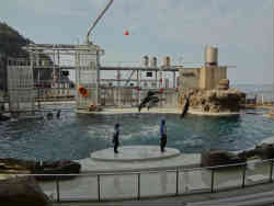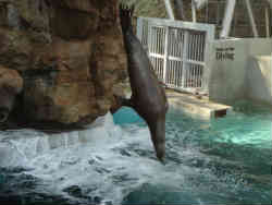 次にボス(警備隊長?)であるセイウチが出てきて色々と腹筋運動をして貫禄を見せつけます。最後にはバンドウイルカによる6mの高さによる大ジャンプです。 この海獣達によるショーは他では無い数多くの海獣を使っています。結構おもしろかったです。 | ![]() |