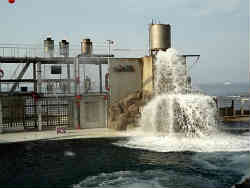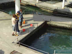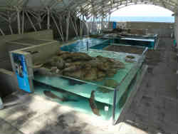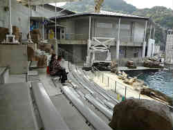 次に移動の途中で小アジの釣り堀が有ります。1竿数630円(エサ付き)で釣り放題です。釣った魚は別料金(1匹40円〜60円)で捌いてテンプラにして貰えます。左は次のアトラクションで「ドルフィンタンク」です。 | ![]() |