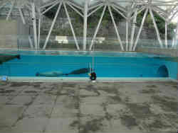さて最後のアトラクションはイルカショーです。観客は左右合わせて数組です。それほどガラガラでこのような状態は初めてです。私は中央に陣取ります。プールの規模は通常サイズです。 | ![]() |