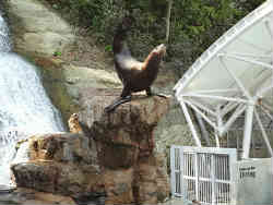 次の「トドのダイビング」というアトラクションです。4匹のトドが岩山を昇りダイビングします。以下HPの説明文です。急勾配の岩山を登るトドの運動能力や岩場で逆立ちする驚異のバランス感覚にまず驚いてください。そしててっぺんまで登ったトドが、5m下へダイビングする光景はまさに圧巻。さらにトドのダイビングの水しぶきが、目の前で砕け散る大迫力。2F観覧スペースはスプラッシュゾーン。 | ![]() |