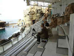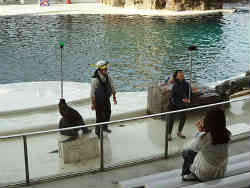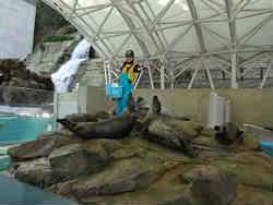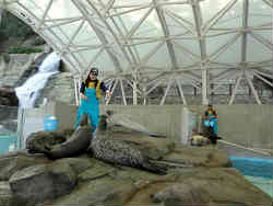 次は「アザラシのロッククライミング」というアトラクションです。以下HPの説明文です。ここのプールは時間によって、干潮満潮が演出されます。干潮時には岩場が現れ、急斜面、緩斜面を登るアザラシたちの運動能力が見られます。岩場を登ったアザラシたちに、スタッフが給餌しながら楽しいアザラシのお話が聞けます。食事を終えたアザラシは、岩場からすべるようにプールへ飛び込み、これもまたすごい運動神経。 | ![]() |