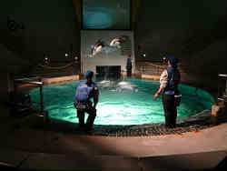 カマイルカを調教していて小さな屋内のイルカショー的なことをします。周りは円形のドーム型で2階にもイスがあります。正面のスクリーンに体温測定のシーンや生態の紹介がなされます。以下はHPの紹介文です。ドルフィンタンク 「イルカの肌ってどんな感触なんだろう」、「イルカのおへそってどこにあるんだろう」。そんなことを実際に確かめられるのがこのドルフィンタンク。とにかく、カマイルカとの距離感が驚きです。 | ![]() |