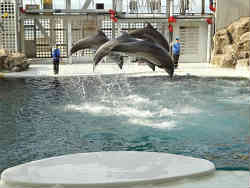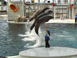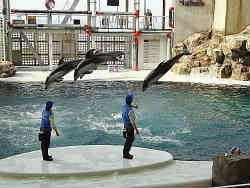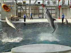 次にイルカの種類を変えます。先ほどのはカマイルカ(小さめ)ですが次にバンドウイルカ(大きめ)です。右はイルカにロープを引っ張らせて手前の係員に渡し、そのロープを頭上まで張り巡らせて、1頭から最後は4頭までそのロープを飛び越えさせるジャンプです。左はバンドウイルカがスピンしながらジャンプさせています。 | ![]() |