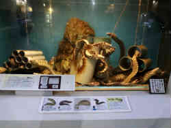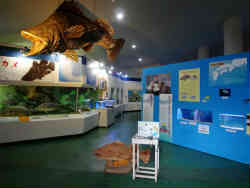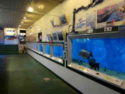 小さいながらもイルカショーがあるみたいですが、すでに終わったばかりで水を抜き掃除をしています。次回の公演はだいぶ先なので見られません。少なめのプールで2匹のイルカが泳いでいます。右はリュウグウノツカイという深海魚の剥製で、漁師の網に引っかかって運ばれたらしいです。その時は生きていましたがすぐに絶命で剥製の運命でした。 | ![]() |