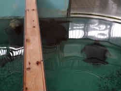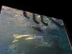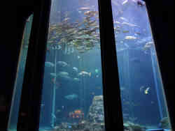 入ってすぐにメイン水槽があります。鉄骨に覆われた縦長の水槽です。水とアクリル面はやや濁っています。イサキ・ニザダイ(サンチャン)・コガネスズメダイ・アカマツカサ等の魚がいます。 | ![]() |