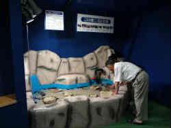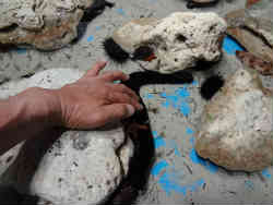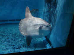 タッチングプールに私も触ってみました。黒い細長い物はナマコです。左はマンボウでフグの仲間で成長すると3m程度になるらしいです。 | ![]() |