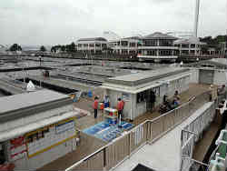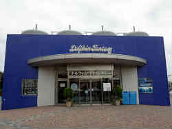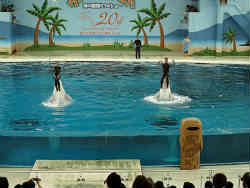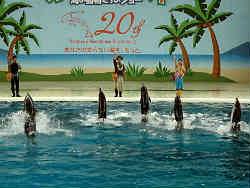 イルカたちもどこの水族館でもやっている芸を披露します。身振り手振りから水中での高速水泳・尾びれを使っての起立やジャンプなど多才です。左は観客席の全体です。終了直後ですので観客はもう少し居ましたが・・。 | ![]() |