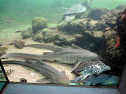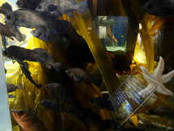 あと小さな水槽が並んでいます。右は「育てる海」と称して昆布の中にお馴染みのメバルがいます。メバルという魚は他の水族館でも同じですが、ほとんど動きません。群れでじっとしているだけです。夜行性なので夜になると活発に動き回るのでしょう。左はトラフザメとアカウミガメが水槽のコーナーにじっとしています。他にも定番の魚も多く展示されています。 | ![]() |