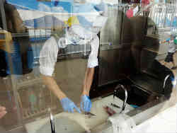 | これは貸し竿(600円)を借りてアジを釣りそれを魚代と調理(1匹150円)で食することができます。捌く模様も窓越しに見ることができます。釣った以上は美味しく頂こうという趣旨です。 | ![]() |