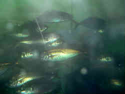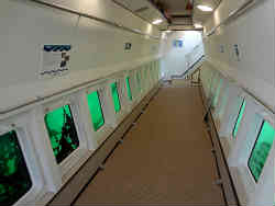 次はガイドデッキ(まるで波止を歩いているかのよう)を通り、「サブマリンリサーチ」と呼ばれる海中展望船です。中に入ると両サイドに窓が有り海中を覗くことができます。餌付けしているのでアジがウロウロしています。また網には牡蠣やヒトデ・昆布などが付いており海中の勉強になるということです。 | ![]() |