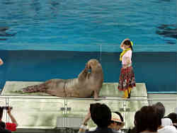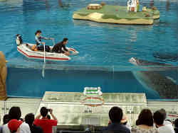 次に「海の動物達のショー」が始まるので向かいます。大きめのプールにて始まりです。観客の半分は幼児達です。ここのショーの特徴としては、1.ゴムボートを使う 2.浮いている島を使う 3.セイウチ・イルカ・アシカ・ペンギン・ジンベイザメ・ゴンドウクジラ と多彩な海獣達を共演させていることです。 | ![]() |