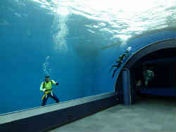 次は「ふれあいラグーン」です。入ると大きなチューブ状の水槽を通り抜けます。左右の幅は結構広いのですが、魚たちは余りいません。居るのはバンドウイルカとダイバーぐらいでした。3名ほどのダイバーが水槽の壁を磨いています。掃除は片手に白いメラミンスポンジともう片手には吸盤です。 | ![]() |