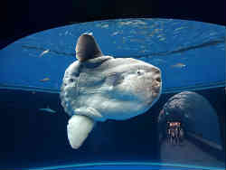 違う水槽には傷ついた大きなマンボウが居ます。マンボウはかなりデリケートな魚らしいので周りの壁は気を遣わなければなりません(と以前に聞いたことがある)。なおパンフレットによるとこの水槽(水中トンネル)で結婚式ができるみたいです。 | ![]() |