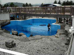 赤いキャップ帽が幼児達です。ダイバーもいて白いゴンドウクジラの上に乗ったり潜ったりとなかなか見応えがあります。しかし平日なのか観客はガラガラに近い状態です。 | ![]() |