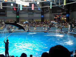 入ってすぐにイルカショーが始まりますのでプール(ホール)の方へと進みます。かなり大きな円形のプールです。観客は半分強程度入っています。一角は要人が来るのでしょうか?テープで区切って空いています(あとで理由がわかりましたが)。ここはカマイルカやオキゴンドウ・バンドウイルカなど出演します。 | ![]() |