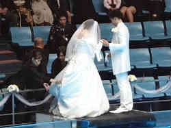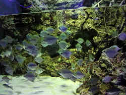 冒頭に記述している一角は結婚披露宴のためでした。ショーが終わると正装した人(親戚・友人)がぞろぞろと例の一角に入ってきました。そして最後には新郎と新婦が台上に上がり皆(一般観客含む)の祝福を受けています。私は途中抜けましたけど・・。使用料はいくらかかるんだろうと思いました。こういうのもあって良いかなと?(私は無理ですが娘の分がまだある)プールを抜けてようやく水族館の魚たちを鑑賞します。 左はヒメツバメウオとテッポウウオの水槽です。 | ![]() |