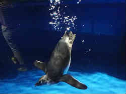 次はペンギンの水槽です。綺麗な水槽ですが、内外含むディスプレイは無いもありません。ペンギンたちは海上を泳いだり水中を潜ったりと楽しそうです。しかしペンギンだけなら下関の海響館が一番ですね。 | ![]() |