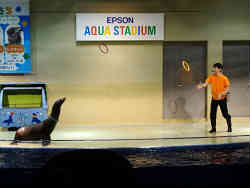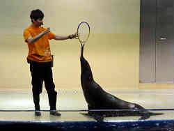 次にアシカプールにてショーの始まりです。一人目のお兄さんです。テニスラケットを載せたり(ボールは簡単だが棒状の物は難しいみたい)、輪を連続で投げ次々に首にかけていきます。 | ![]() |