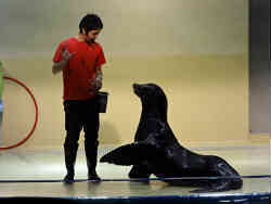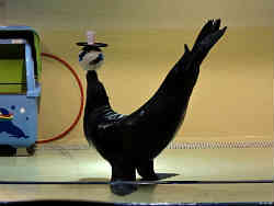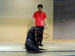 次は二人目のお兄さんです。フラフープを回したりしましたが、左は馬のマスクをかぶっているアシカです。アシカでは初めてです。よく似た事が二見シーパラダイス(セイウチ)でやって多様な気がします。シャッターチャンスを設けてかなり長い時間このままでした。 | ![]() |