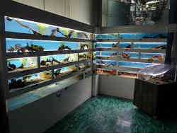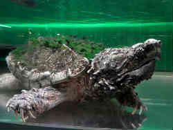 右はワニガメ(淡水に住むカメとしては最大で寿命は50年)で、口の中にある赤い舌でエサを誘います。体力温存のためほとんど動かないのだそうです。左はジーベンロック・ナガクビカメです。インドネシアに住んでおり、首は長いので折りたたんで入れるそうで、かつては数十万円の価値があったとか。 | ![]() |