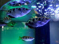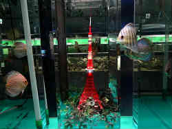右は東京タワーをあしらった水槽です。左はアーチャーフィッシュというテッポウウオです。 | ![]() |