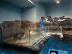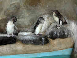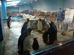 右は先ほど説明した深い水槽を上から見たところで、右下にペンギンが立っています(この写真ではほとんどわからないが)が当然作り物の模型です。左は横から見たところですが、手前に2羽のヒナがいます。ガラスはやや汚れていますが、この場所はヒナがいるため親の気をたてるといけないので掃除ができないそうです。と注意書きがありました。 | ![]() |