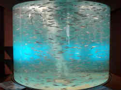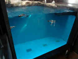 メインのペンギンの水槽です。見学は大きく3箇所に分かれています。ひとつは1階からでここは水深4mの水槽の下から見る事ができます。右はペンギンが水中を早く泳いでいます。ペンギンは陸上のヨタヨタ歩く姿と違って水中では魚なみに泳ぐことができます。ずんぐりした体の中は骨の密度が高く骨が重く沈みやすいつくりとなっています。左は一般的な魚が入った水槽です。 | ![]() |