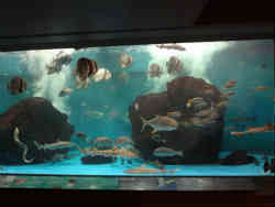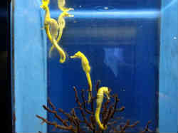 右はタツノオトシゴでオスが雌の卵をふ化させると言うことです。黄色が派手な魚です。左は2階に上がった場所で、先ほどの深い水槽の上にあたります。開館直後だったので飼育員たちが掃除をしています。 | ![]() |