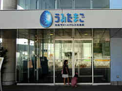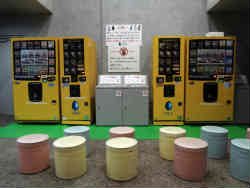 右は浄化装置を窓越しに見られる箇所です。海水はうみたまごの前の海で沖合70m・水深25mの場所から1日7200トンの量をくみ上げていて処理しているそうです。左は水族館では初めて見ましたが、飲料の自動販売機コーナーで、紙パックは持ち出し禁です。万一プールに落ちると誤飲するそうです。ちょっとした休憩所にもなっています。 | ![]() |
