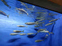 右は関サバと関アジでとても美味しそうです。大きさは30〜40cmぐらいです。豊後水道は潮の流れが速いので、速吸の関と呼ばれていてブランド魚です。左は小さなカタクチイワシの群れです。ちょっと小ささ過ぎるかな?。 | ![]() |