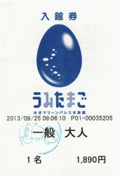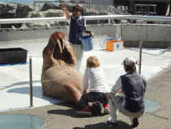 セイウチのショーです。セイウチは体が大きい割には結構器用で芸覚えが良いみたいです。クビや手・脚を器用に動かし降ってくれます。ゲストとして小学生や大人の方(写真)が手伝いをさせられてご褒美のチュー(かなり口臭が臭いらしい)をもらっています。ショーの後は体に触れることが出来る触れ合いの時間もあります。他の水族館では鳥羽と二見シーパラダイスで同じようなショーをしていましたが、内容規模ともここが一番小さいです。 | ![]() |