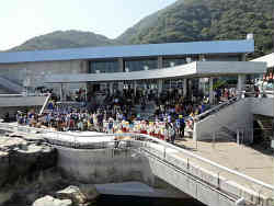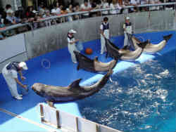右はイルカのジャンプシーンで通常のジャンプはもとより、ひねり・前方回転などもこなします。左写真はショー会場で前述したとおり観客席がほぼ無いに等しい感じです。平日でもいっぱいでしたので休日となればもっと大変だろうなと言う印象です。 | ![]() |