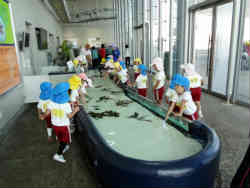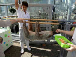 右はナマケモノでエサをやっているのを見られます。その間少し触ることが可能です。手の先には牙ほどの爪が見て取れます。左は幼稚園児達が触っている屋内タッチングプールで、ナマコ・ヒトデ・貝・メジナ・ボラなどが入っています。 | ![]() |