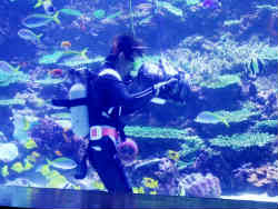 これは「サンゴ大水槽での水中散歩」というアトラクションで魚にエサを与えています。このダイバーさんは男性で、水中の岩の穴から勢いよく登場します。大半が水面から下りてきて潜るんですがここは違います。プールの外では女性の解説員がマイクで解説してくれます。またここでは観客は水槽の前に小さな座マットを敷いて座って聞くことができます。また左写真はダイバーが水中カメラを使って珊瑚礁の細かな部分や特徴をモニターに映し出して解説しています。 | ![]() |