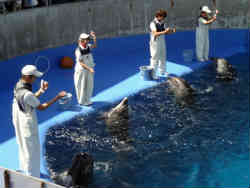 どこでもあるような輪投げ・ボール運びとこなしていきます。こうやってあちこちのイルカショーを見ていると芸を仕込むのは割と簡単にできるんだなという印象です。 | ![]() |