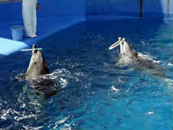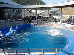 次に最後のショーとしてイルカのパフォーマンスの時間です。ここでは4頭のイルカ(1匹は違う種類)が色々な芸を披露してくれます。このプールは底に窓が有り、そこでも水中の様子を見ることが出来ます。プールの規模は小さい方ですが、綺麗な作りです。残念なのはきちっと座ることのできる観客席が無いと言う事です。私はもっと上に常設された立ち見席から撮っています。 | ![]() |