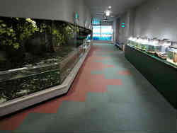 右は一番大きい水槽でアカエイ・トチザメ・スズメダイ・ウメイロ・エイ・ハギなどの一般的な魚が入っています。左はニジマス・アヤメなどが入っている淡水魚コーナーで、右にはチンアナゴなど小さな水槽が並んでいます。小さな水槽類の説明はほとんど読んでいません。水族館の全体的なレポート(点数化)が主な目的ですので、他の方(水族館見学がほとんど無い人)と比較してざーと見るだけです。 | ![]() |