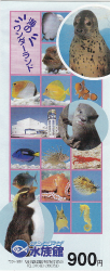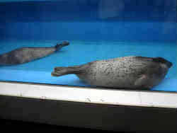 右はサケの稚魚で3〜4年で体長70cmほどになります。川で生まれ海へ旅をして再びふる里の川に戻り産卵をして生涯を終えます。イワシみたいに群れますが同じ方向にグルグル回りません。左はゴマフアザラシです。名前の由来は体表面にある斑紋から胡麻斑(ゴマフ)となりました。魚が大好物で口に入る物なら何でもOKだそうで、水族館の大半はイカナゴの大きい物が与えられています。 | ![]() |