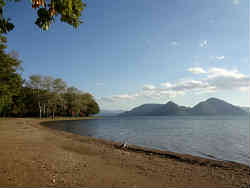 小樽から登別までドライブです。途中時間があるので昭和新山に立ち寄ります。右は洞爺湖の湖畔で誰もいません。 | ![]() |