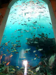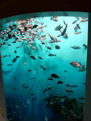 ホテルに止まった後マリンパークニクスの到着です。ぱっと見はお城のようです。入場時はガラガラの状態ですが・・。橋を渡り入場後縦長の円柱の水槽です。2階まで繋がっておりおおよそ6mぐらいでしょうか?。この中にアカマツカサ・アメミフエダイ・ヒレグロコショウダイ・カンモンハタ・ニザダイ・ハナミノカサゴ等の魚が泳いでいます。海水はやや濁っています。 | ![]() |