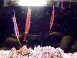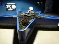右は星形のタッチングプールです。誰もいません。左はヘコアユという魚です。ヘコアユの特徴としてはアユという名前が付いていますが川にいるアユとは全く関係がありません。垂直に泳いでいるのが特徴ですが前進にエビの殻のように甲板で覆われて曲げることができません。しかし尻尾で左右上下に素早くこの姿勢で泳ぐことができるのです。 | ![]() |