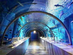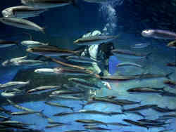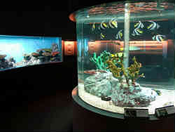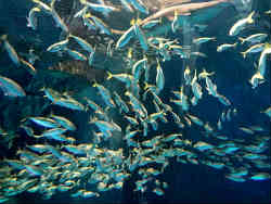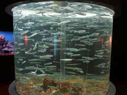 右はサケの稚魚です。サケは川で生まれ海に行き4年でまた帰ってくるそうです。左は最近では定番となっている水中トンネルでオオカミウオ・クロソイ・エゾメバルなどが泳いでいます。 | ![]() |