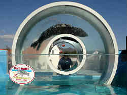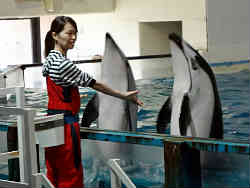 右は魚の群れの中にダイバーが掃除をしています。左は会場を替えてカマイルカのショーの始まりです。背びれの部分が極端にカールした鎌に似ているのでこの名前が付きました。飼育員のお姉さんが合図して手前に来て尻尾で立ってご挨拶です。 | ![]() |