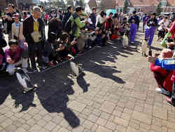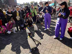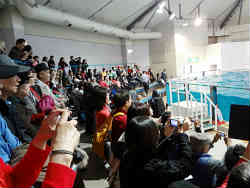 最後はペンギンの散歩です。白線を敷き廊下の状態の中をペンギンがヨチヨチ歩いて行きますが、やはり外国人はなかなか規制線から中に入り写真を撮るというわがままぶりを発揮しています。飼育員の方から何度も注意されています。私は撮りやすいようにとコーナーの角を位置取りしていますので邪魔されずに撮れました。 | ![]() |